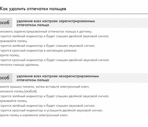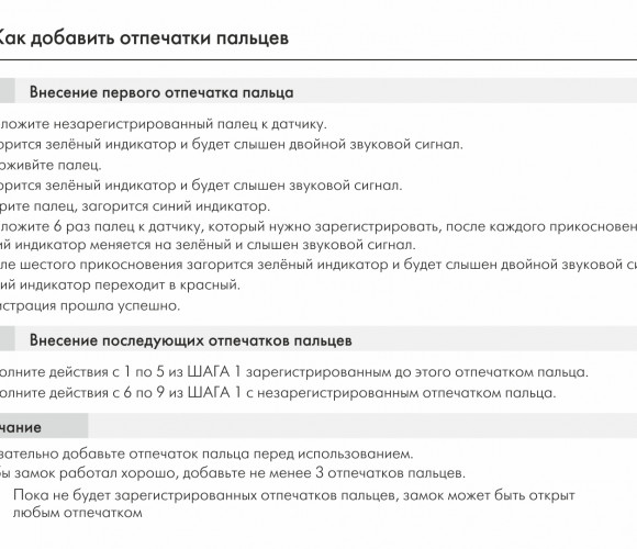 Модель обладает высокочувствительным быстро реагирующим биометрическим датчиком. К замку можно настроить до 20 отпечатков пальцев. До момента настройки замок может открыть любой отпечаток.