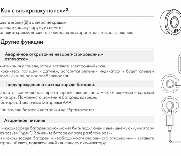 Если ранее настроенные к замку отпечатки утрачены, замок может быть открыт с помощью электронного ключа через разъем Type-C.