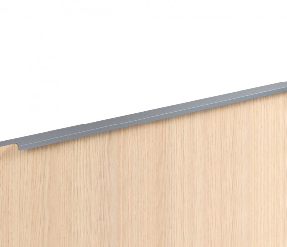 Ручка имеет богатую палитру цветовых решений и разнообразие длин. Данная модель допускает размещение двумя способами — «в размер» фасада и по центру широких фасадов (как большой «язычок»).