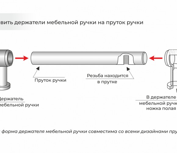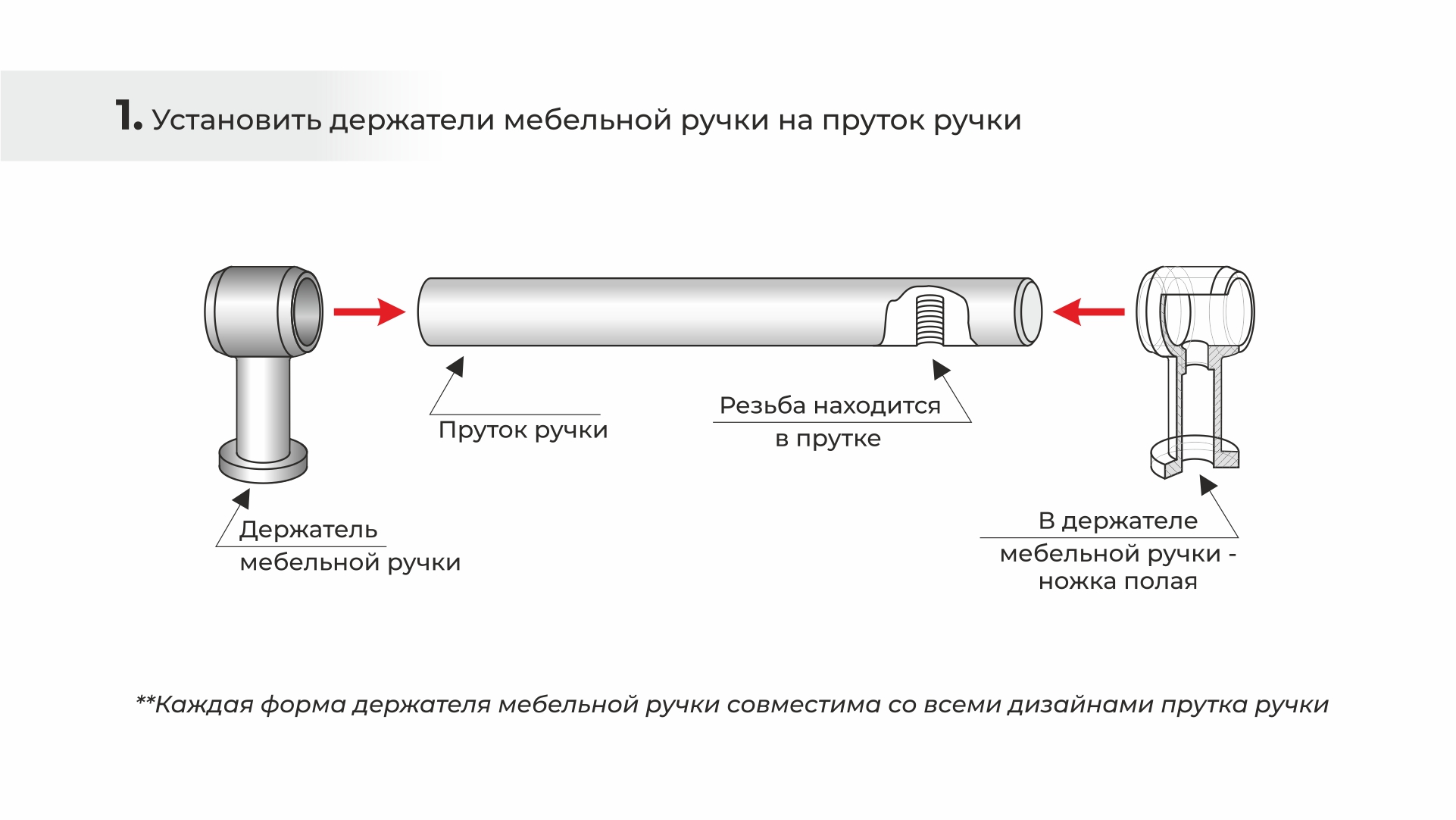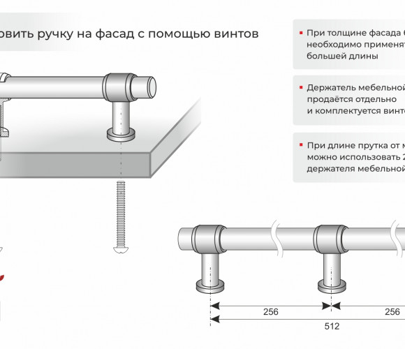 В модели предусмотрены готовые монтажные отверстия для держателей мебельной ручки и крепления готовой ручки к фасаду. В ручках с межцентровым расстоянием от 128 до 320 мм по 2 монтажных отверстия, а в удлинённых форматах — (512 мм, 960 мм, 1152 мм) 3: по краям и в центр прутка.