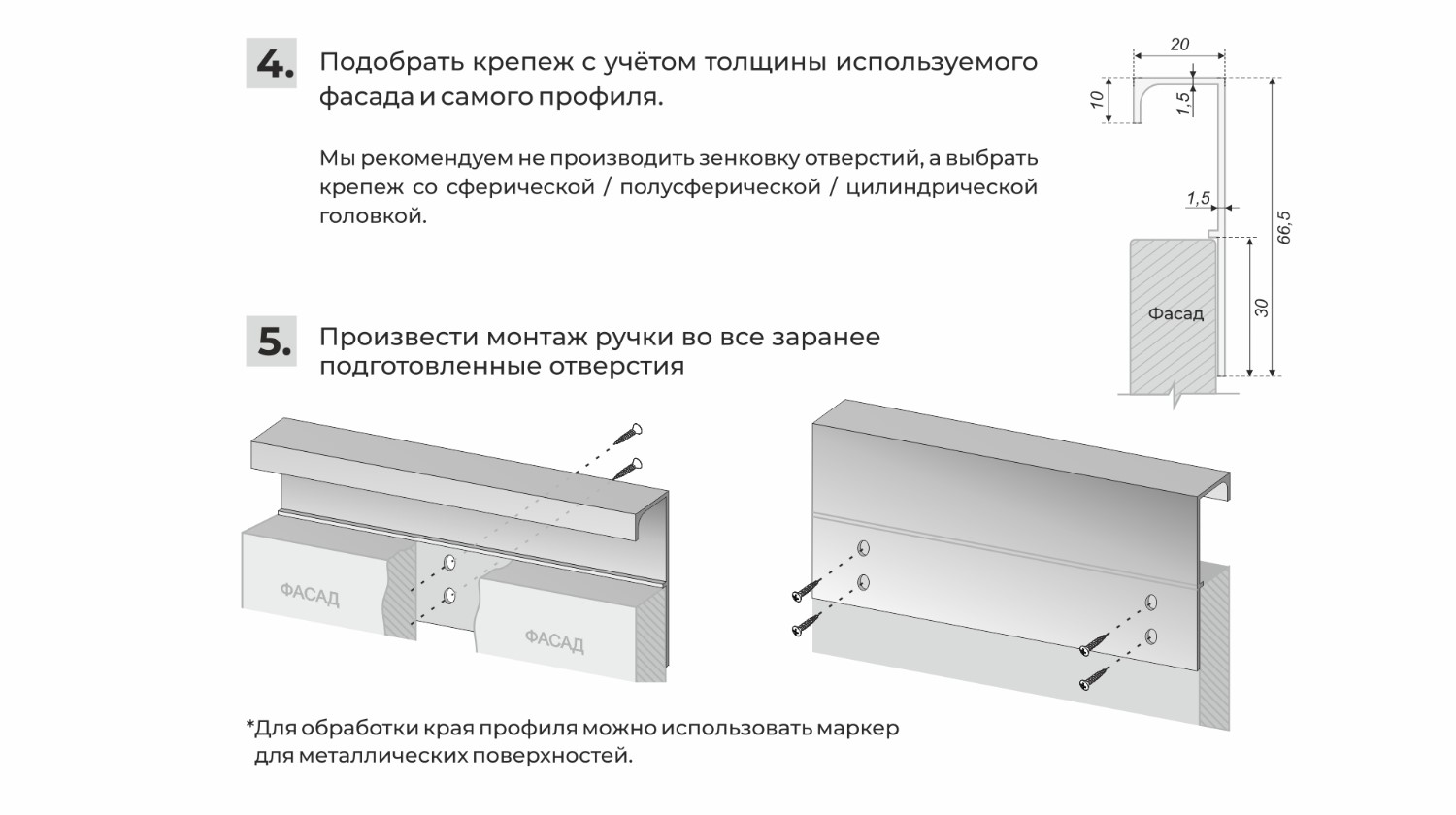 Монтаж ручки не требует дополнительной фрезеровки, профиль накладывается на фасад и закрепляется саморезами с задней стороны. Быстро и просто! Подходит для фасадов любой толщины.