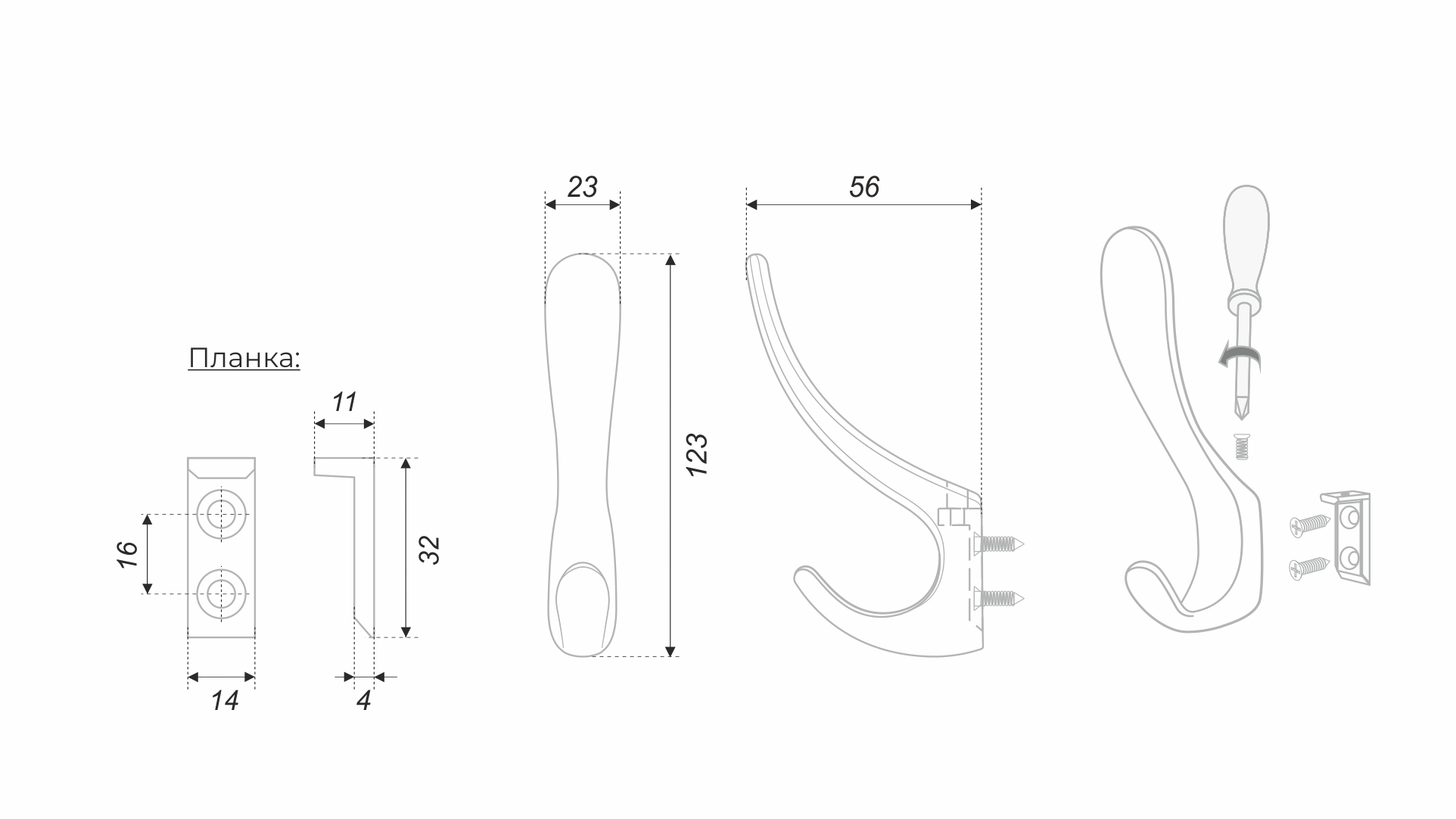 В комплект входит: крючок, крепёжная планка, саморезы 4х18 (2 шт.), крепёжный винт (1 шт.), ключ шестигранник. Рекомендуемая установка на плиту толщиной 16 мм.