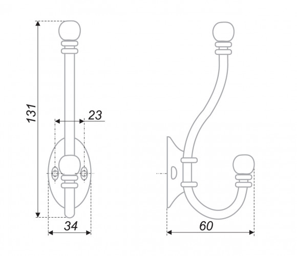 Мебельный крючок традиционного дизайна с округлыми навершниками и декоративными дугами на концах рожков. Дизайн модели способствует лучшему удержанию навешанных вещей. Обтекаемая форма удобна и безопасна в ежедневной эксплуатации. Допустимая нагрузка позволяет использовать крючок как для одежды, так и для сумок, пакетов весом не более 10кг. Модель будет лаконично смотреться на гарнитурах классического и неоклассического стиля.
