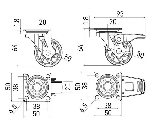 Опора колесная с фланцем, D50мм с тормозом, прозрачное KM-BH50MM-00 GTV
