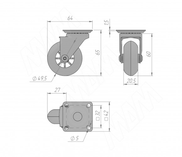 Опора колесная, D50 мм, без стопора, с площадкой, прозрачное колесо CST70