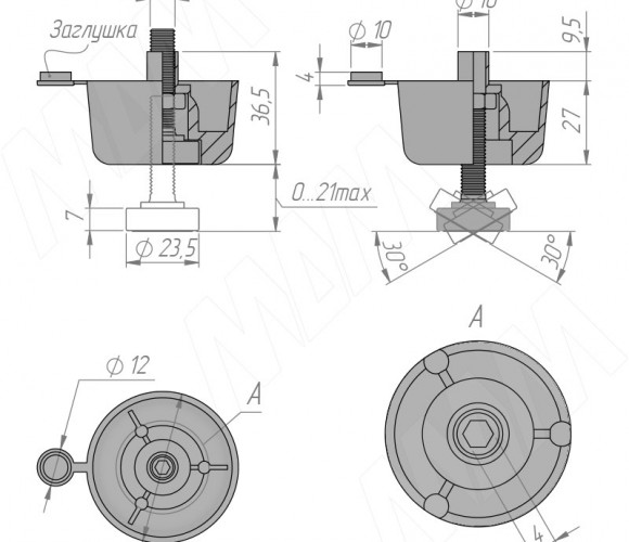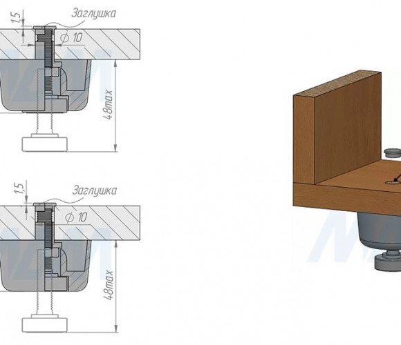 • регулировка высоты осуществляется через сквозное отверстие в дне конструкции;