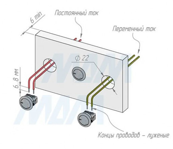 Установка и подключения: подготовить установочное отверстие ∅22 мм; зафиксировать провода в пружинных терминалах.