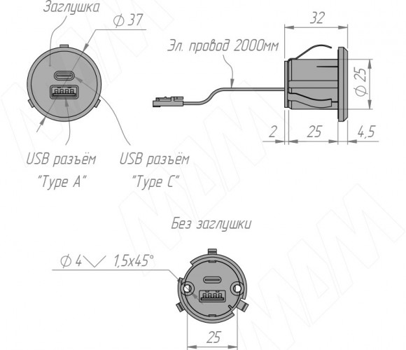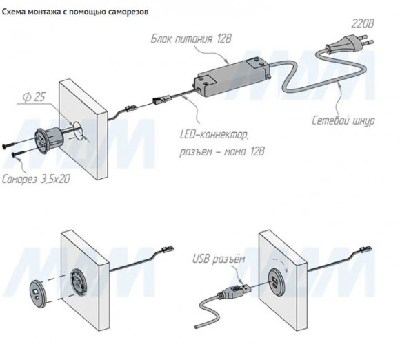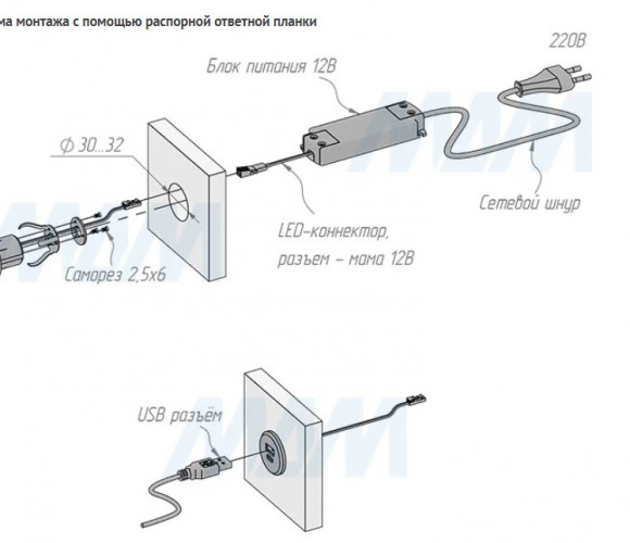 Внимание! Для USB-розетки необходимо дополнительно приобрести блоки питания постоянного напряжения 12В с минимальной нагрузкой по мощности — не менее 15Вт.