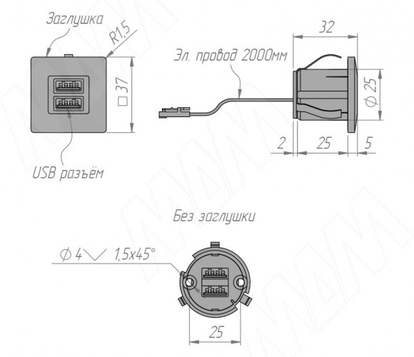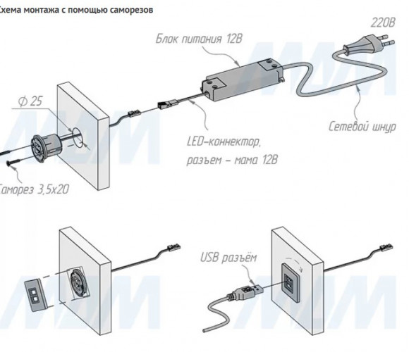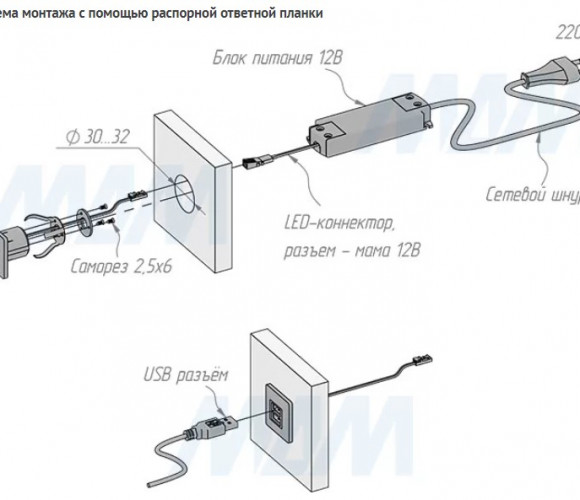 Внимание! Для USB-розетки необходимо дополнительно приобрести блоки питания постоянного напряжения 12В с минимальной нагрузкой по мощности — не менее 15Вт.