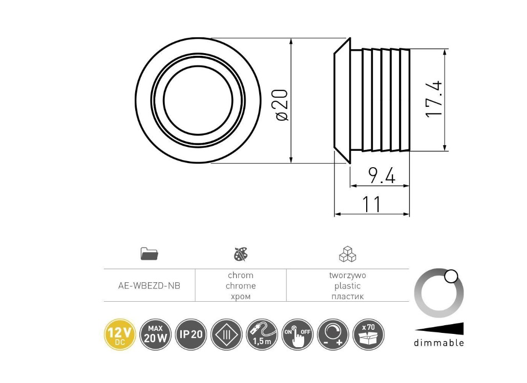 Максимальная мощность осветительного прибора (светильник, LED-лента), на которую рассчитан выключатель - 20 Вт (W).