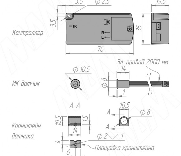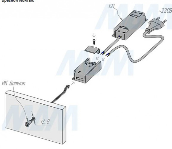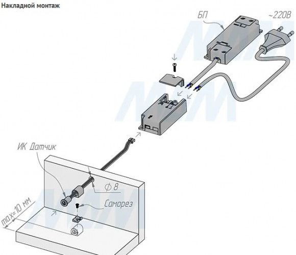 Комплектация: инфракрасный датчик с проводом, электронный блок, крепление для накладного монтажа, саморез