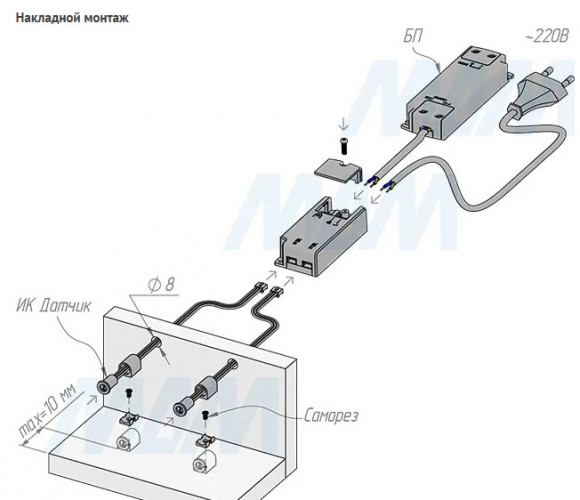 Комплектация: инфракрасный датчик с проводом — 2 шт., электронный блок, крепление для накладного монтажа — 2 шт., саморез — 2 шт.