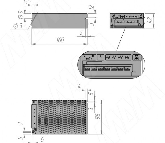 Блок питания преобразует первичное сетевое напряжение до постоянного выходного напряжения 12 В.