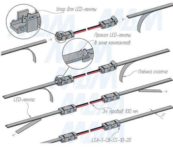 Применение: коннектор позволяет соединять два отрезка светодиодной ленты SMD или COB шириной 5 мм