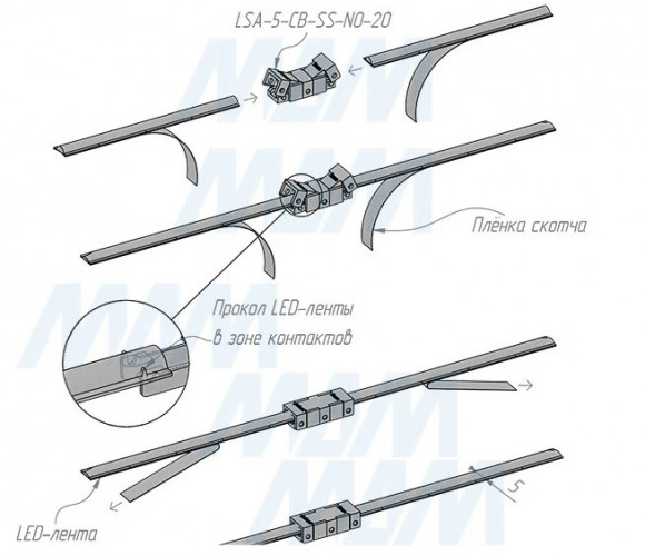 Применение: коннектор позволяет соединять два отрезка светодиодной ленты SMD или COB шириной 5 мм
