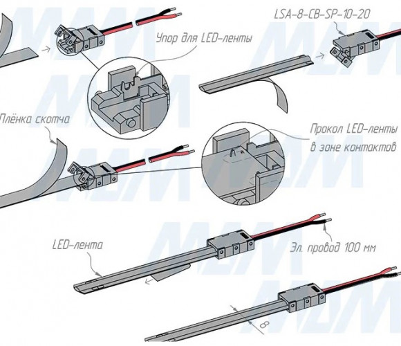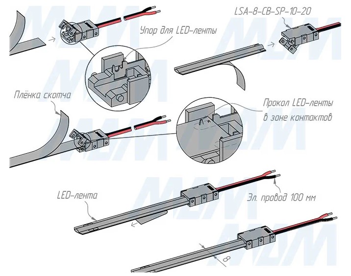 Применение: коннектор позволяет подключать к блоку питания светодиодную ленту SMD или COB шириной 8 мм