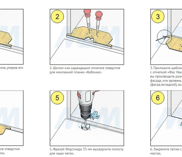 3. Для установки петель лучше всего использовать усиленные саморезы 4×16 мм или «евросаморезы». Они исключат риск вырывания петель при эксплуатации мебели.