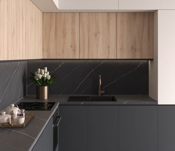 Темный монументальный декор, будто бы пронизан многочисленными изломами вулканической породы с тонкими светлыми прожилками. Этот декор идеально впишется в интерьер современной кухни и придаст особенный шарм в ее оформлении.