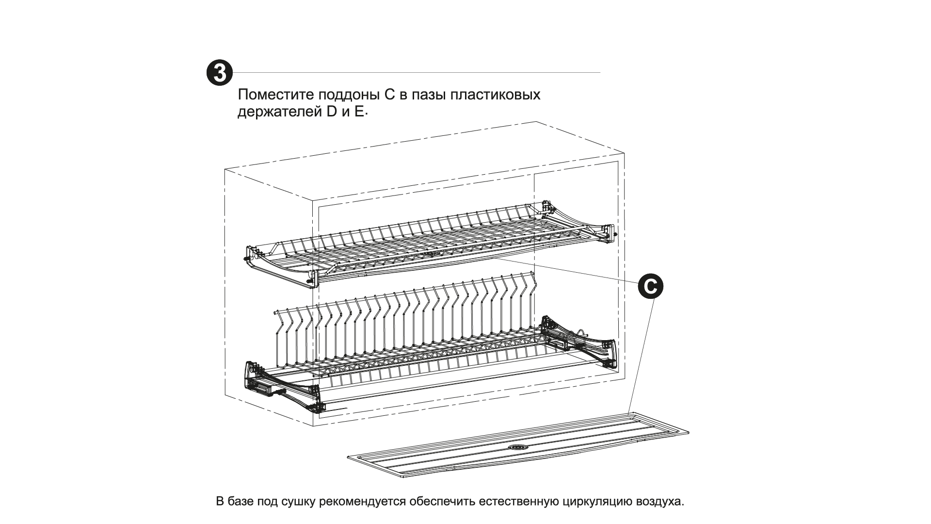 Конструкция LORA SU06 позволяет полностью интегрировать сушку с верхней базой мебели и отрегулировать её по глубине в мебельном коробе. Пластиковые держатели нижнего яруса и алюминиевая трубка имеют специальный паз для установки задней стенки мебельного короба. Полезное пространство под сушку по глубине варьируется в диапазоне от 320 до 370 мм. Выдвижной элемент в составе пластиковых держателей нижнего яруса даёт возможность отрегулировать положение сушки до задней стенки в пределах 50 мм.