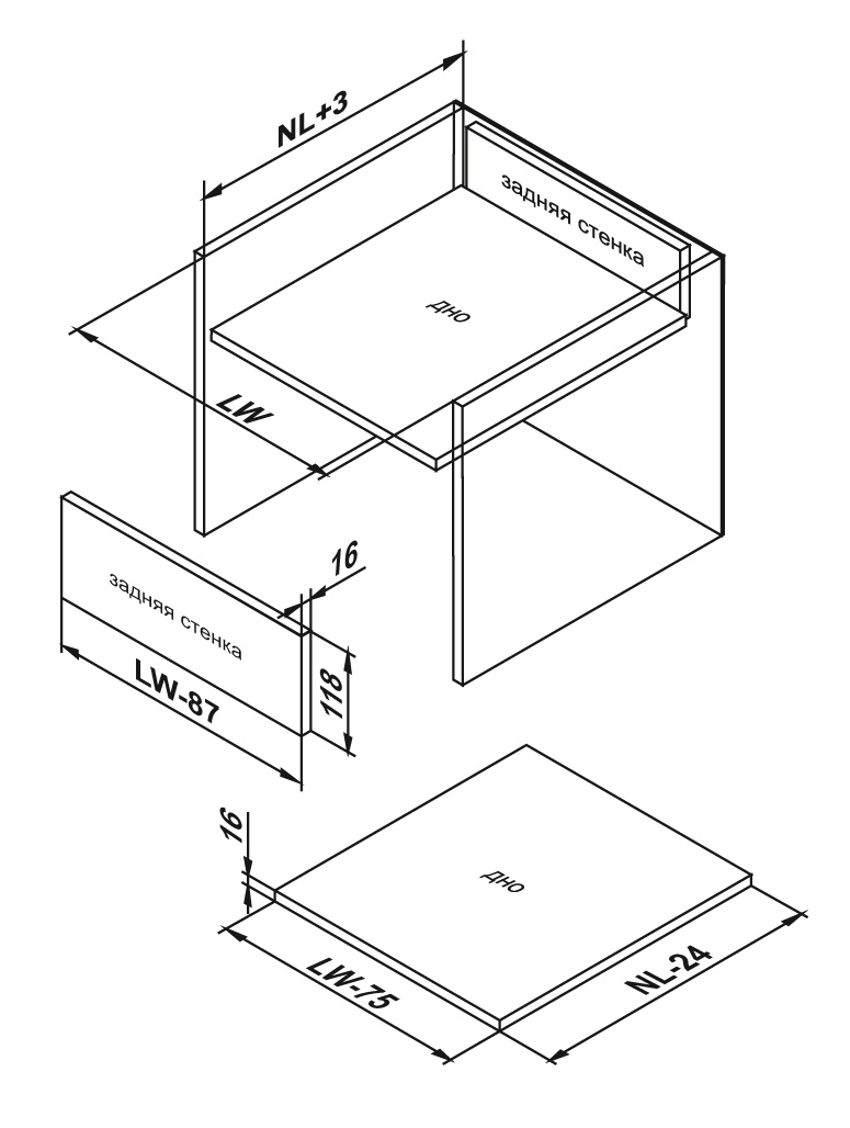 Для сборки выдвижного мебельного ящика с помощью боковых стенок ( SBDW11, SBDW12, SBDW13 ) необходимо самостоятельно изготовить фасад, заднюю стенку и дно ящика, изготовленные с учетом собственных пожеланий и потребностей по ширине и высоте готового ящика. Схема раскроя дна выдвижного мебельного ящика соответствует уже зарекомендовавшей себя популярной системе B-BOX SB04 и европейским аналогам.